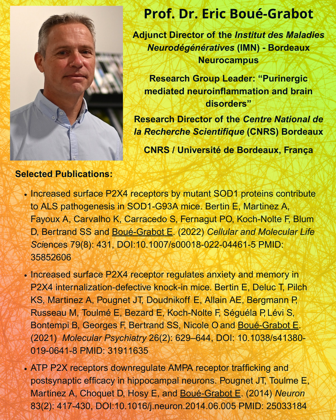 O primeiro palestrante a se apresentar dentro desse grupo de seminários será o professor Eric Boué-Grabot, um dos líderes do grupo de pesquisa "Purinergic mediated neuroinflammation and brain disorders" no Institut de Maladies Neurodégénératives (IMN), CNRS / Université de Bordeaux, França.