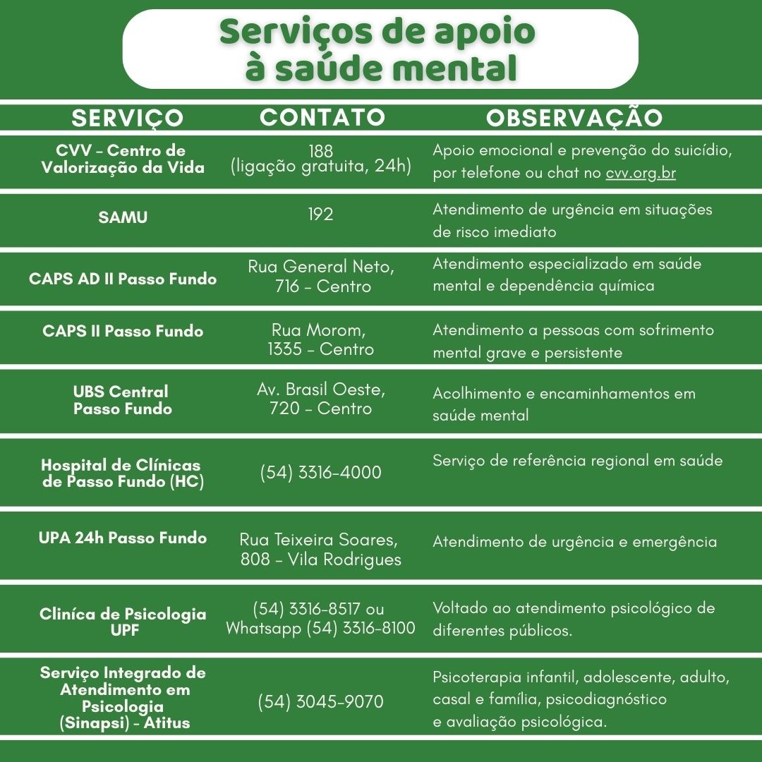 Cuidar da saúde mental é fundamental em todas as fases da vida. Em nossa cidade, existem diferentes serviços que oferecem acolhimento, atendimento de urgência, psicoterapia e acompanhamento especializado.