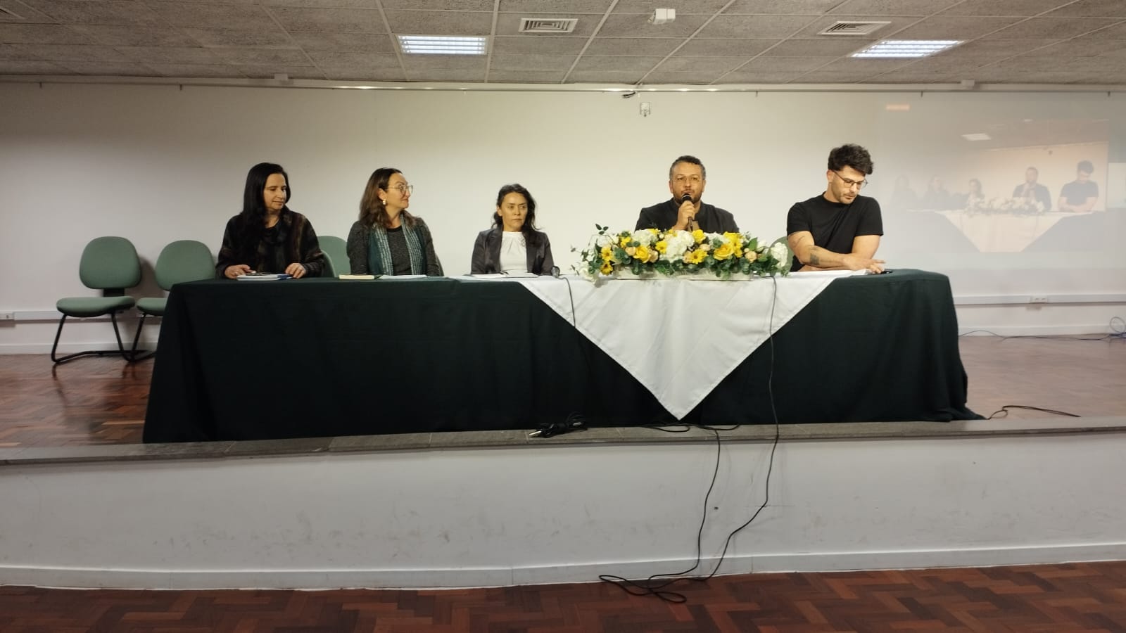 Mesa de ex-coordenadores composta pelas Professoras Zoraia Bittencourt, Adriana Loss, Adriana Richt e pelos Professores Fábio Feltrin de Souza e Jerzy Brozowski (que participou remotamente).