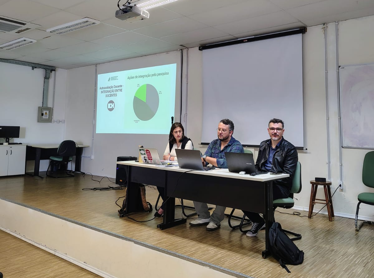 Seminário de autoavaliação conduzido pela professora Paula Lindo e os professores Reginaldo Souza e Éverton Kozenieski.