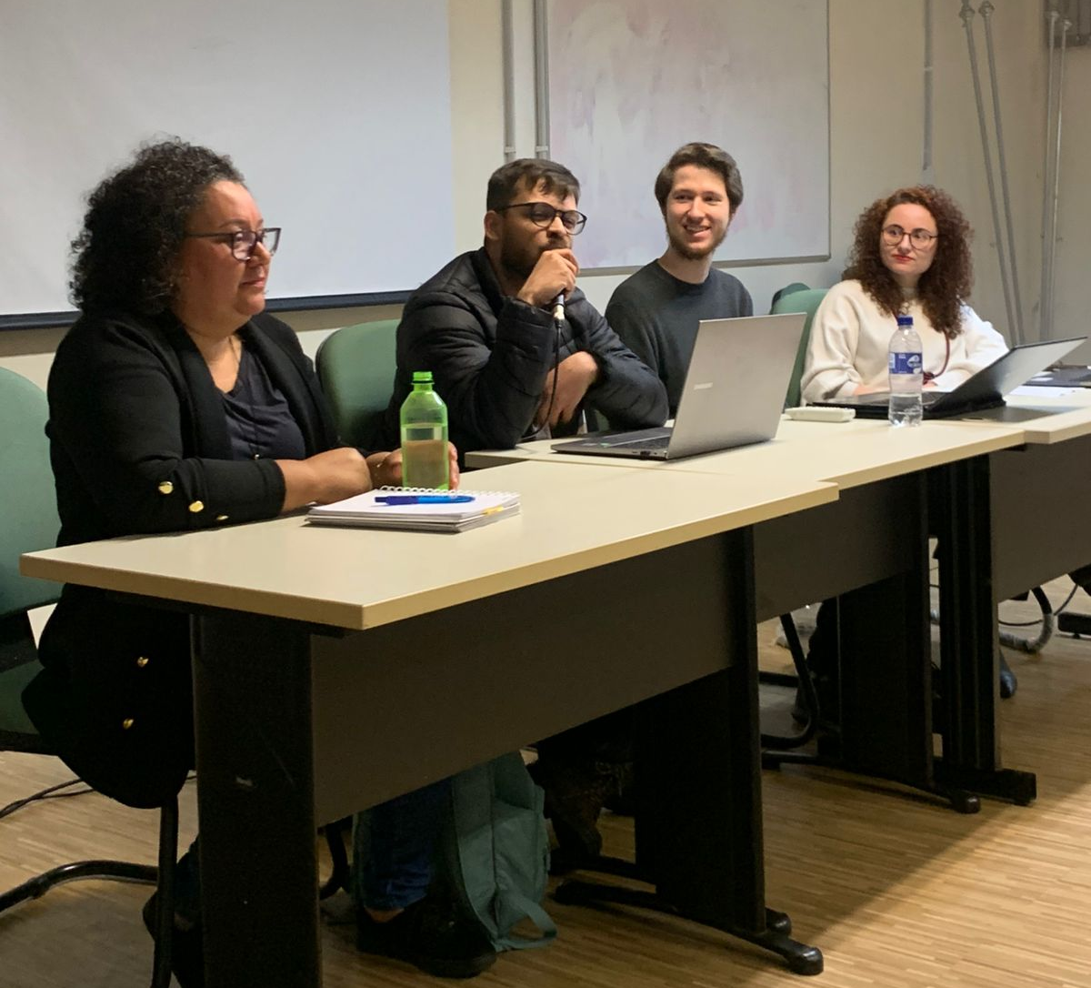 Mesa de egressos composta por Luciana Veiga, Paulo Acácio, mestrando Guilherme Schons (mediador) e Silvana Ribeiro.